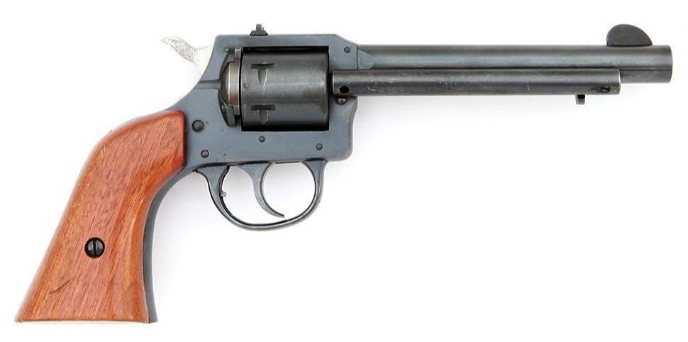 “.22 LR or .22 cal., furnished with further cylinder, just like Mannequin 949, Western model, double motion, aspect loading, 5 1/2 or 7 1/2 in. barrel, 6 shot, walnut grips, blue end, switch bar ignition system. Mfg. 1976-1985.”